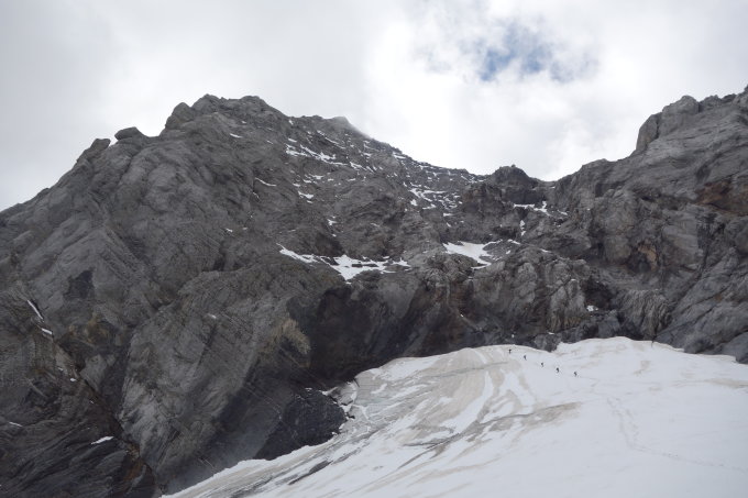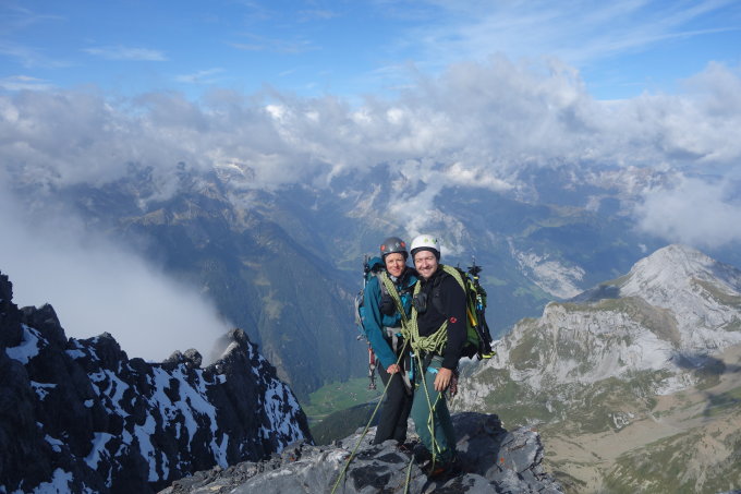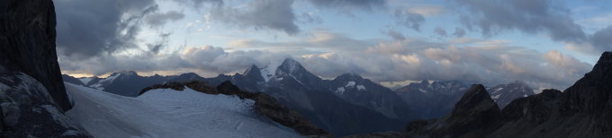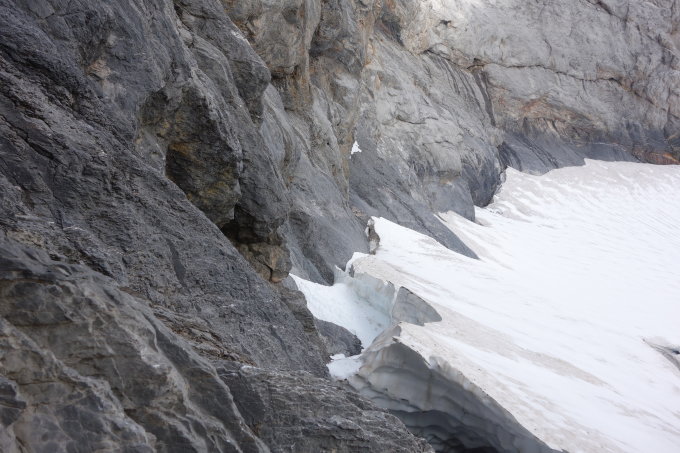 Als Material hatten wir ein 50m Einfachseil, 3 Friends (0.5 - 2) und 5 Exen dabei. Friends sind vor allem dann im letzten Teil (PLatte) im Abstieg auf den Gletscher sinnvoll.