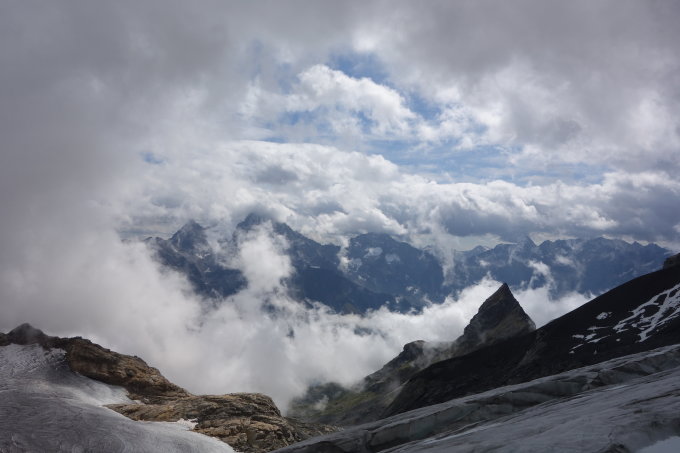 Start um 5:30 von der Windgällenhütte, am Gletscher um 7:00, am Bergschrund um ca. 8:00. Im steilen Teil im Aufstieg zum Bergschrund liegt wadentiefer, nasser Schnee, es hat aber jetzt eine Spur. Der Bergschrund kann dank des Neuschnees relativ einfach überwunden werden, allerdings erreicht man so den Einstieg zu der kurzen III - IV Kletterei, die nur über 2 schlechte Schlaghaken verfügt. Am Ende hat es einen einfach Stand. Der Einstieg zur Fixseilvariante hat momentan einen sehr weiten Abstand am Bergschrund, keine Spuren gesehen, aber evtl. gehts ??.