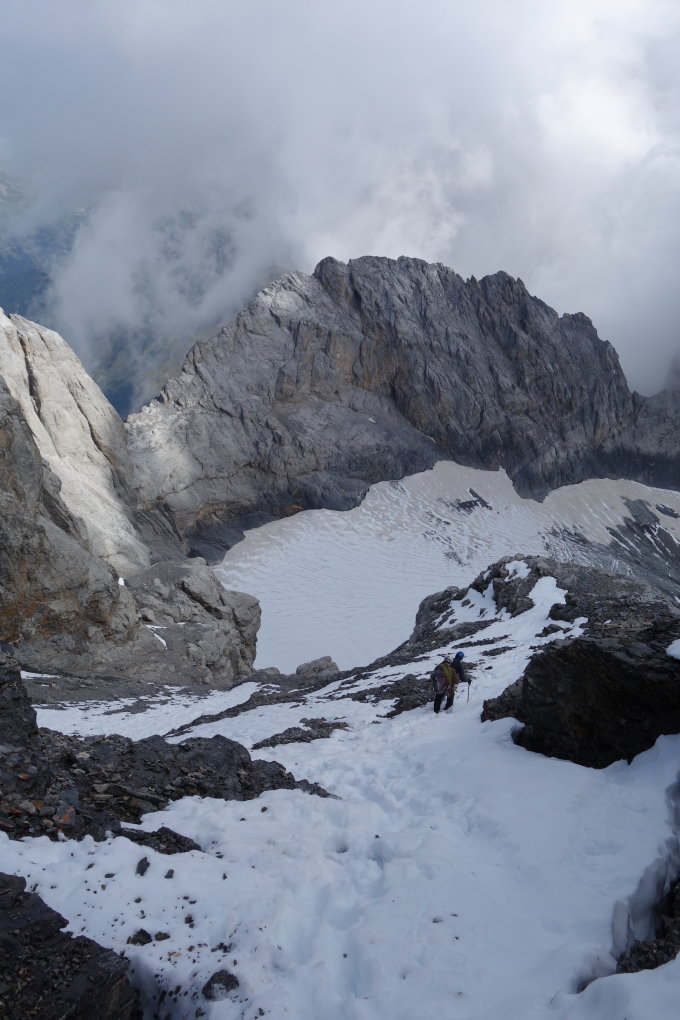 Bei unserer Abstiegsvariante (hoch wie runter) konnte man nicht direkt auf den Gletscher abseilen, sondern man musste eine abwärtsgeschichtete Platte von ca. 30m Abklettern unterhalb der IV Kletterei.Beim Übertritt zum Gletscher ist Vorsicht geboten, da dort Schnee auf Teils dünnem Eis liegt. Abstieg am teils schuttbedeckten, aperen Geltscher.