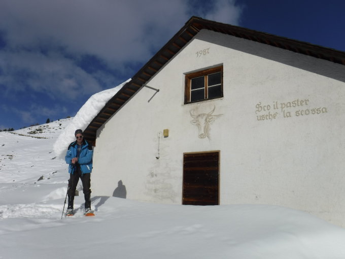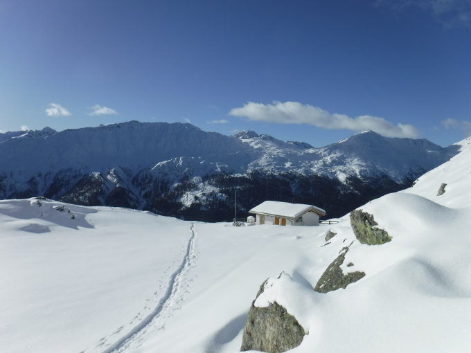 Wollte eigentlich über den Flüelapass anreisen, der im aktuellen Alpen-Pässe-Bericht am Vortag noch als schneebedeckt befahrbar gemeldet war. In der Nacht wurde dieser jedoch im Verkehrsfunk als gesperrt gemeldet aus Vorsichtsgründen. Ebenso auf den Straßenschildern als gesperrt angezeigt. Nach dem Mittag gab es diese Meldung zwar nicht mehr. Dennoch musste ich auf dem Hinweg langen Umweg fahren über den Julierpass. Deshalb später Tourenbeginn. Dafür traf ich im Aufstieg frische Spuren an. Bis zur Alp Valmorain eines SS-Gängers. Weiter eine Skispur von einem Tourenpärchen, die ich bei den Felssteinen am P 2599 antraf. Ab dort wechselten wir uns beim Spuren ab. Die beiden fuhren dann über den Sassalba-Sattel weiter.