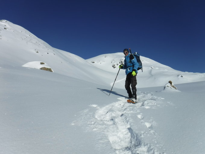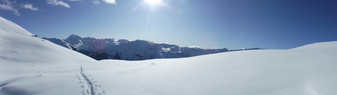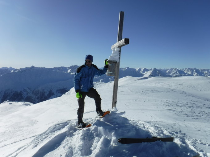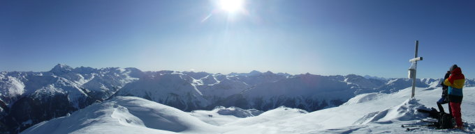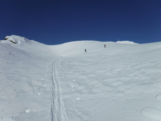 Tourenbeginn um 09:25 Uhr bei -3°C unter wolkenlosem Himmel. Im Gipfelbereich blies etwas kalte Bise aus westlicher Richtung. Exzellente Pulverschneeauflage von 10 cm bis zu 20 cm an den Lee-Seiten der Hänge. Mit hartem Untergund darunter ließ sich die Route insbesondere im Abstieg schnell und knieschonend laufen.