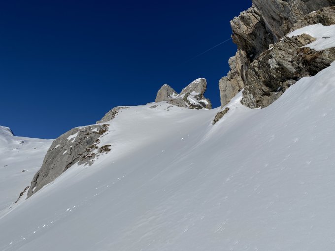 Der Gipfelhang im Hartschnee kein Genuss aber gut machbar. Auf etwa 2500 Wiederaufstieg zur Chären und zum Chalchhorncouloir abfahrend traversieren. Hier nochmals mit Fellen in die Scharte. Ich erwische die Scharte einige Meter zu weit links und steige ein paar Meter zu Fuss ab. Im grossen Hang zwei Abfahrts- und eine Aufstiegsspur, wahrscheinlich von gestern. Mehrheitlich pulvrig aber nicht mehr top, teils auch gedeckelt. Im Bereich Lochhüttli knapp Schnee (Steine).