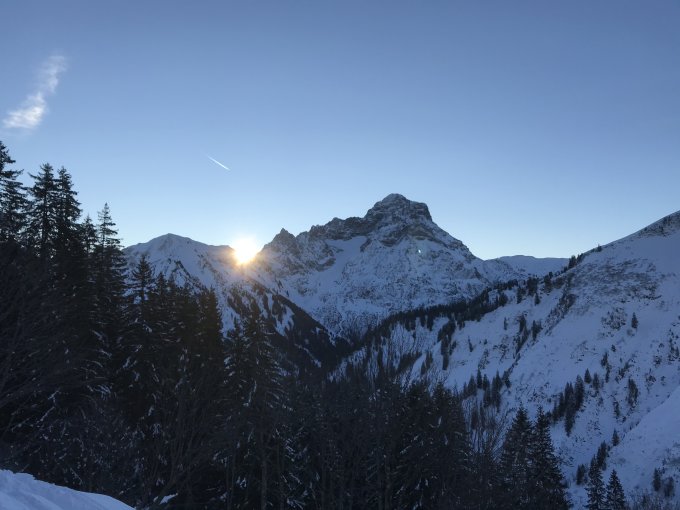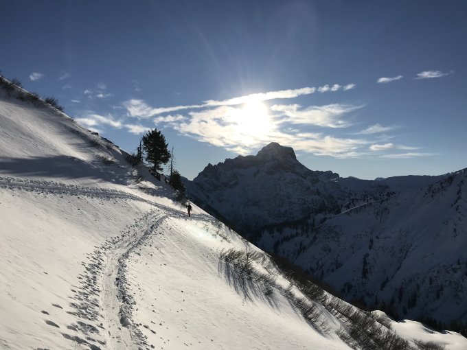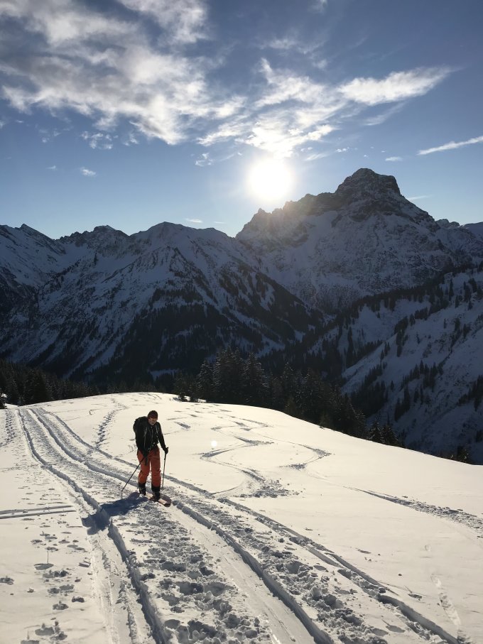 Traumhafte Verhältnisse am heutigen Dreikönigstag. Sonne, Windstill und Pulverschnee - was will man mehr! Start um 7:30 Uhr in Baad bei -3 Grad. Die gesamte Route ist sehr gut eingespurt. Die etwa 200m hohe Waldstufe komplett zerfahren und die Aufstiegsspur teilweise etwas glatt. Oben im freien Skigelände dann wieder easy zu gehen. Insgesamt findet man eine sehr kompakte und gut gesetzte Schneedecke vor. Lediglich steile Südhänge und die untersten 100hm haben einen Deckel. Ansonsten findet man noch gut gesetzten Pulver vor, der sich traumhaft fahren lässt. In der Waldsteilstufe war der Schnee dann aber auch schnell weich und von der Sonne aufgefirnt. Der Gipfelhang ist bereits weitgehend verspurt. Wir sind den Grat etwas Richtung Hochstarzel gefolgt und haben dort das noch unverspurte Gelände genutzt - ein Traum.