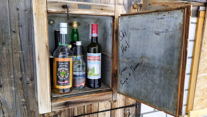 Bei der Fluonalp kann man sich, auch bei jetzt im Winter geschlossener Alpbeiz, einen Schnaps genehmigen;-)