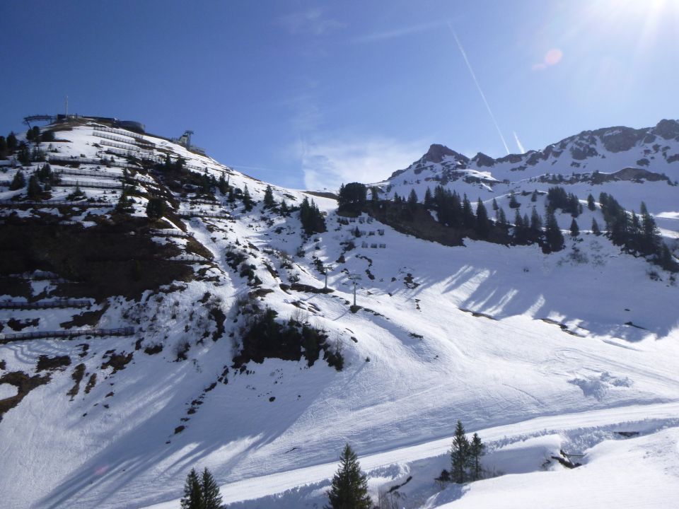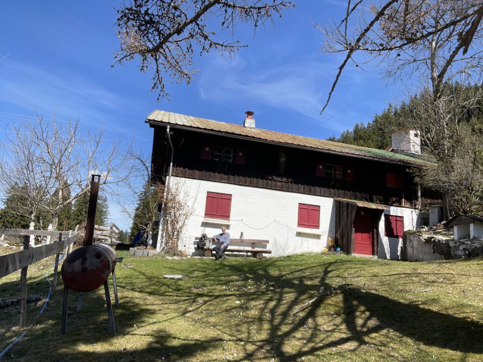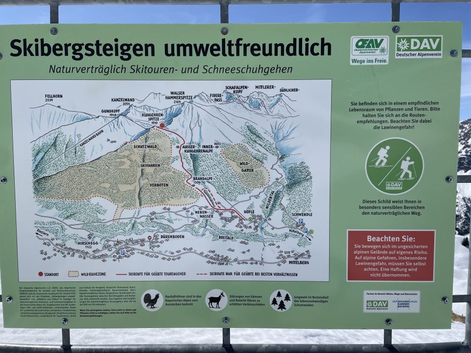 Tourenbeginn um 07:45 Uhr bei 5°C unter heiterem Himmel. Das Skigebiet mit den Liften und Bergbahnen hatte den Betrieb nach dem 6.4. eingestellt. So auch die Kanzelwandbahn. Wegen der nördlichen Schattenlage hält sich der Schnee auf der roten Skipiste mit Nr. 15 bis ins Frühjahr hinein. Insofern konnte man die Laufgeräte bereits an der Talstation anschnallen. Auf westseitiger Route über Äußere Kuhgehrenalpe liegt ab dem Wegweiser am Jäger-Hochstand unterhalb der Kuhgehrenalpe kein Schnee mehr.