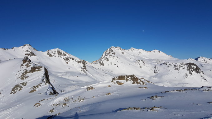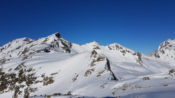 Bin vom Gipfel bin ich etwas westlich von der Aufstiegsspur den Hang runter und etwas weiter unten wieder in die Aufstiegsspur. Dann direkt den Osthang runter über eine kleine Krete mit wirklich super Pulverschnee. Dann wider in die Aufstiegsspur und zurück zum PP La Veduta