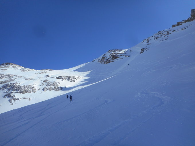Aufstieg: Gut angelegt Aufstiegsskitour im Pulver- und Sulzschnee. Es hatte in der Nacht 20cm Neuschnee gegeben.