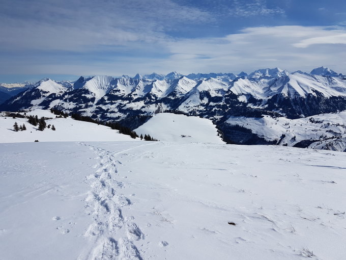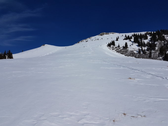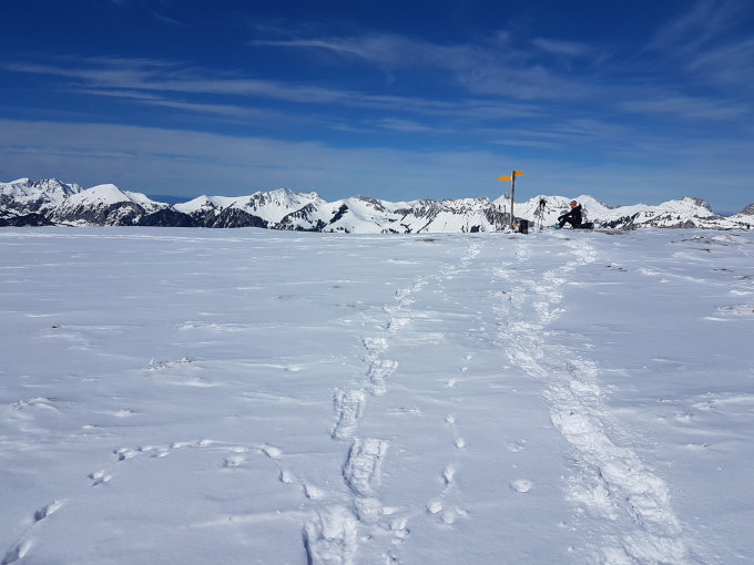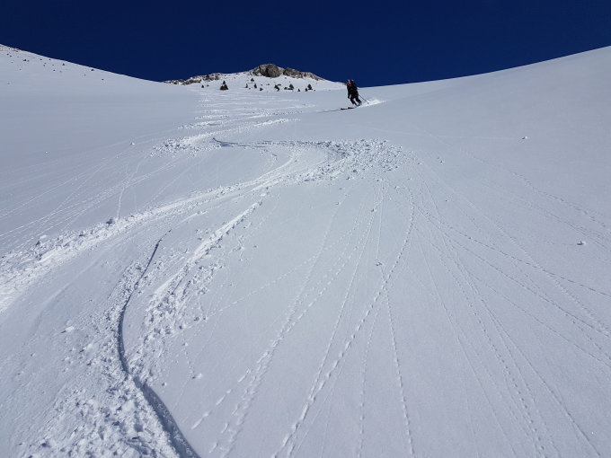 Und siehe da: fast alleine am Berg (nur 2 weitere), unverspurte Hänge rauf und runter und ausser krassem Schneemangel beim Gipfel Pulver und Sulz. Und gegenüber am Menigrat tummelten sich gefühlt 100....