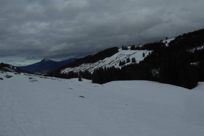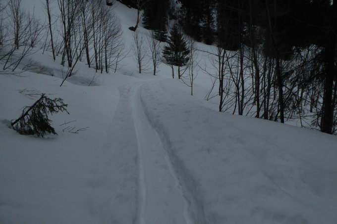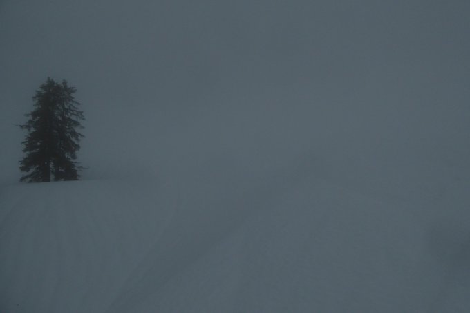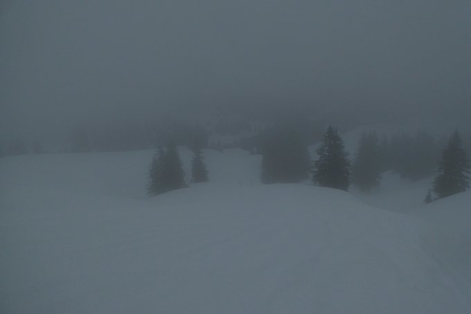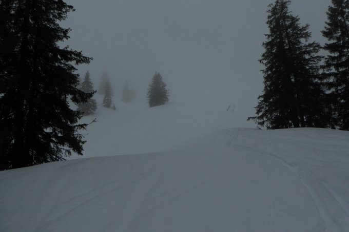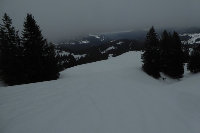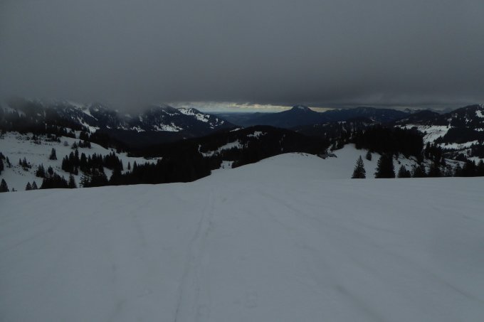 Start bewusst kurz nach 12, da Vormittags noch Regen. Aufstieg über alten Weg über Birkachalpe, Abfahrt über Rappengschwend/Rodelbahn. Aufstieg unten etwas dürftig, in Waldquerung gerade noch ohne abschnallen. Vor Birkach kurze apere Stellen auch ohne abschnallen möglich. Ab Alpe dann genügende und zunehmend mächtige Schneedecke. Am Gipfelhang nach den letzten Bäumen am Rande wurde die Sicht total schlecht, dass ich mich zur Umkehr entschloss. Der Nasse Bremsschnee lies sich einigermassen fahren. Das meiste in der Spur, man wurde heute nicht zu schnell. Darum querte ich zur Rappengschwend, von dort ging es auf griffiger Rodelbahn leicht beschwingt zum VorsäßI runter. Ab Gerstenbrändle auf der sich auflösenden LL-Loipe voll raus.
