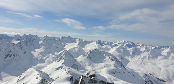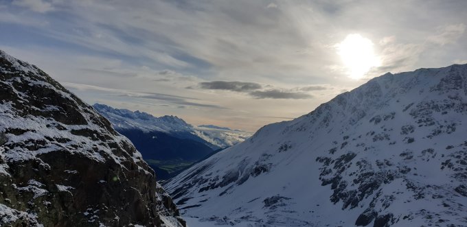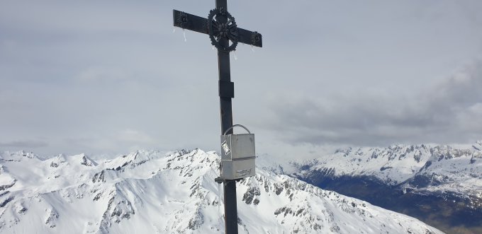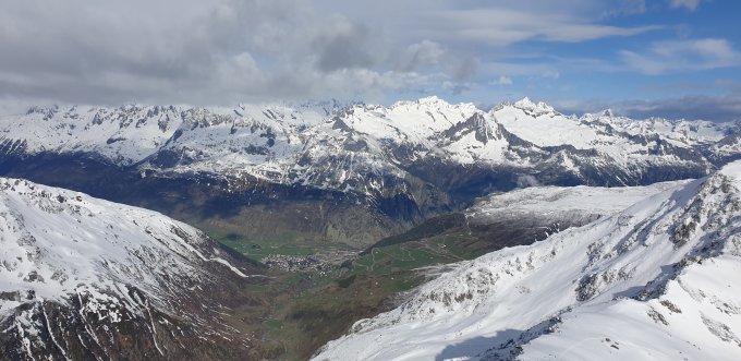 konnten die Ski montiert werden, zuerst noch Hartschnee bis Nurschalas dann einige cm Pulverschnee hinauf zum Tomasee, der immer noch im Winterschlaf ist, hinauf in Richtung Aelpeligrat schon etwa 20 cm Neuschnee, der Schlussaufieg zum Skidebot war Windverblasen, der Fussaufstieg zum Badus war heute die Schlüsselstelle der Tour, der Neuschnee war dort noch geladen mit Wächten, die Abfahrt war Traumhaft wie im Hochwinter, schon bei der Fahrt über die Passhöche wurden die Gipfel im Oberalpgebiet eingenebelt, es vielen auch schon wieder Schneeflocken.