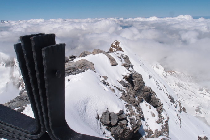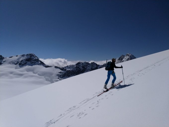 Wir kamen nach einer Claridenüberschreitung und Umfahrung des Clariden Südsporns zum Normalaufstieg. Abfahrt über die NO-Flanke mit dünner Pulverschneeauflage, man musste einmal durch eine steinige Passage durch.