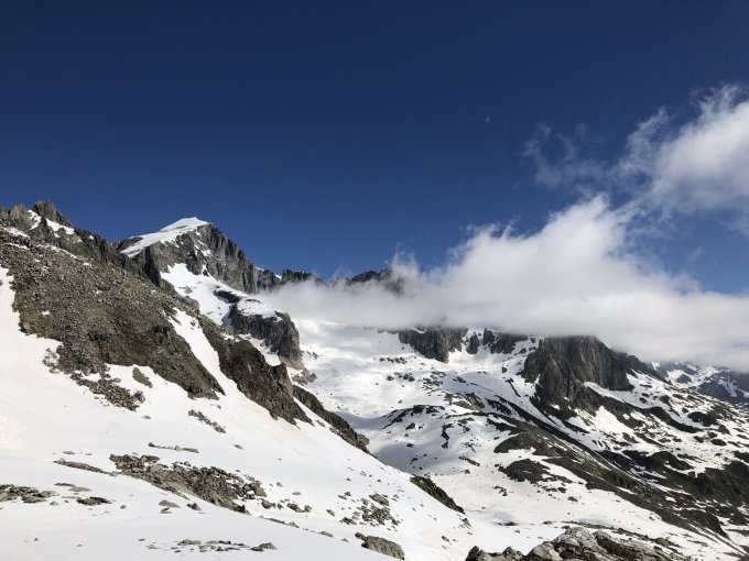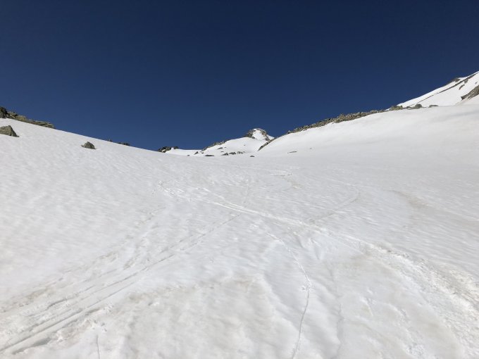 Ich war heute etwas spät dran und von Anfang an nicht mit der Absicht unterwegs, den Gipfel zu erzwingen und dafür womöglich eine schöne Abfahrt zu verpassen. Zuerst mal der Latsch vom Tiefenbach zum Sidelenbach, dort noch eine kurze Tragestrecke ums Eck und dann ein sehr schöner Aufstieg über die abwechslungsreichen Hänge Richtung Punkt 2814. Dabei fand ich Harscheisen angenehm, und ich nehme an am Grat oben gilt dies umsomehr. Knapp unter dem Grat liess ich es gut sein, etwa 2750 MüM, es war schon nach 10.00 und die Osthänge bekommen viel Sonne. Schöne Pause im Windschatten und dann eine im oberen Teil sehr schöne Abfahrt mit Firn al dente. Im unteren Teil dann etwas welliger, aber gut tragend bis ganz unten. Dann das Gelatsche zurück der Strasse nach, meine kaputte Hüfte hat heftig protestiert, aber... s unten
