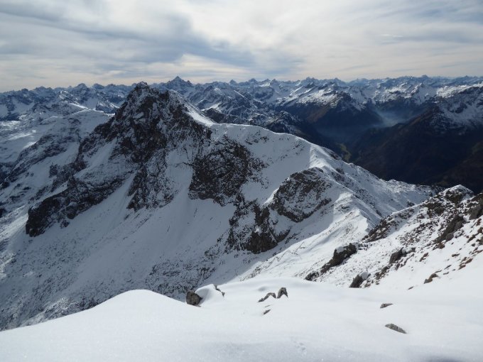 Wetter weniger sonnig wie vorher gesagt, aber angenehm zu gehen. Bis Zirleseck bis auf wenige Meter Schneefrei(Abzweig Feldalp geschlossenen Schneedecke). Ab Z.E.ca. 20-30cm Schnee, war gespurt bis zum felsigen Gratansatz. Dann winterliche alpine Verhältnisse am NW-Grat, ziemlich zeitraubend. Vom Vilsalpsee kamen auch welche, aber wenige. Südseitig natürlich weniger tief. Im Aufstieg nahm ich den Weg übers Köpfl und Wildfräuleinstein.
