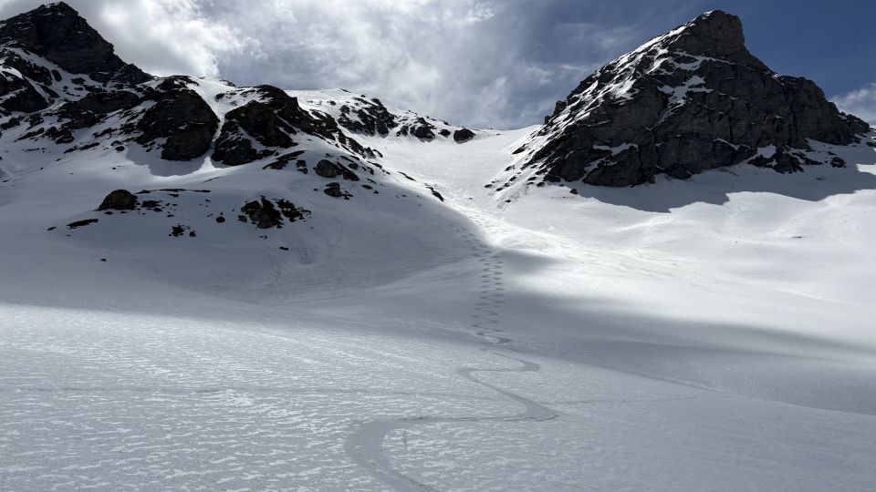Die ersten 200 Hm waren wie erwähnt guter Knusperpulver, danach rasch auf die W-Seite gewechselt und 10 Schwünge in Sahne-Sulz, und wieder in die N-Seite hinein. Das Flaschenhals-Couloir zeigte sich von der besten Seite: Schön aufgesulzt, griffig, rauschend, die schönsten 300 Höhenmeter folgten.
