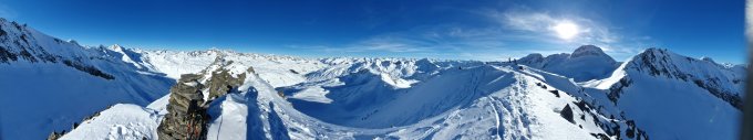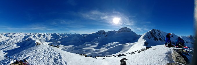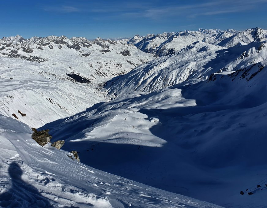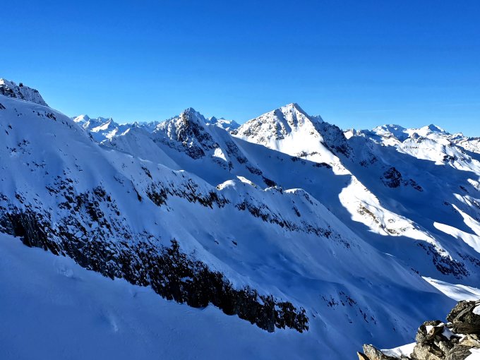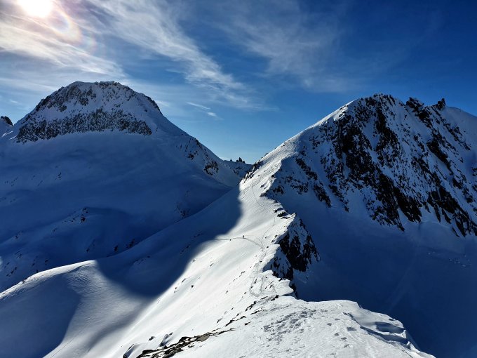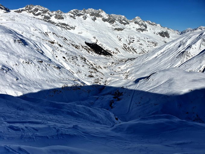 Der grösste Teil der Route liegt derzeit ganztags im Schatten, entsprechend kalte Temperatur. Deshalb noch wunderbare Pulverhänge angetroffen. An manchen Orten aber leichter Winddeckel. Die Steilhänge am Gipfel und unter dem Stelliboden schon ziemlich zerfahren, aber gut zu meistern.