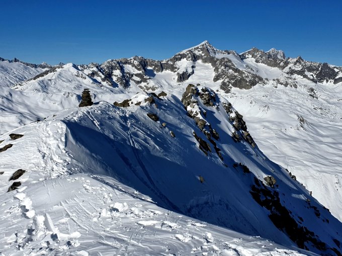 Start um 08.30 Uhr in Realp, bei wenigen Minusgraden. Es ist eine Ratracspur bis zur Abzweigung nach Schweig vorhanden. Gute und speditive Spur im Steilhang zum Stelliboden hoch. Der SE Grat auf den Gipfel kann bis etwa zur Mitte gut mit Ski bestiegen werden. Dann besser zu Fuss, aber problemlos.