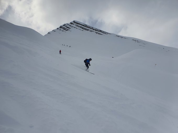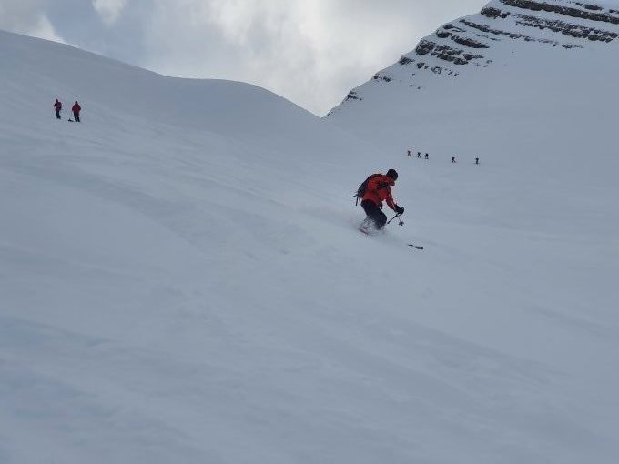 Abfahrt oben rechts haltend. Top Pulverschnee, trotz schon vorhandenen Spuren.