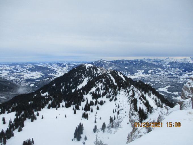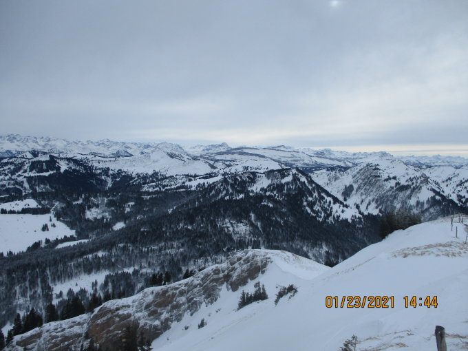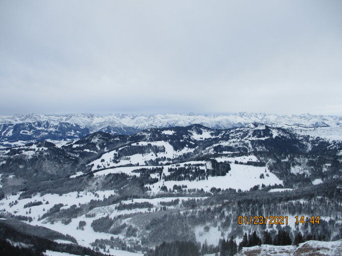 Die Sonne konnte sich, entgegen der Vorhersage, auch Nachmittags kaum durchsetzen. Die Fernsichten waren aber hervorragend, da das Gewölk weit über den Gipfeln hing. Kein diffuses Licht.