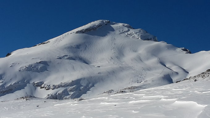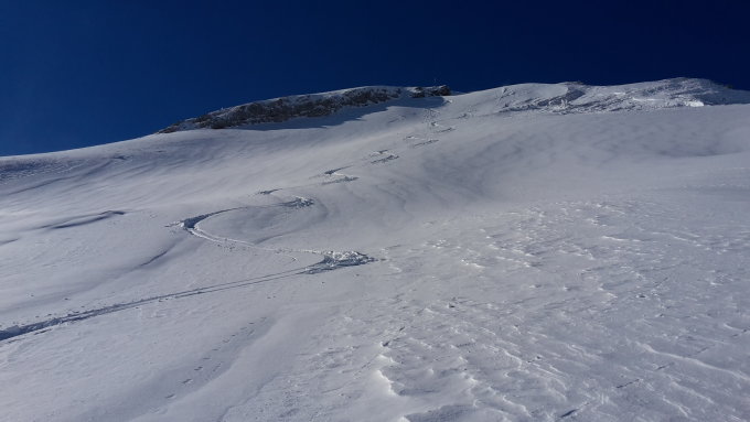 Ein Schneeschuhgänger löste heute im rechten Gipfelhang ein kl. Schneebrett, im Übergang wenig zu viel Schnee aus(ausserhalb der eigentlichen Aufstiegsroute). Er stieg infolge dessen wieder ab.