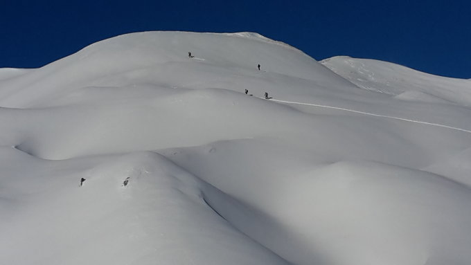 Ich bin ab Glus zeitnah mit einer Zweiergruppe aufgestiegen, welche dann auch suverän eine tiptop Spur in den Gipfelhang legte. Besten Dank dafür.