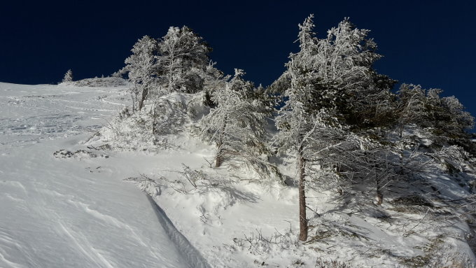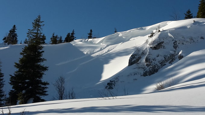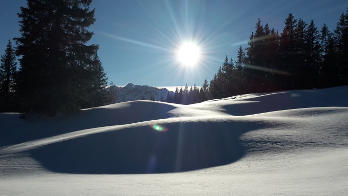 Es hat über Nacht ein schönes Fuder Neuschnee gegeben, welcher die alten Spuren gut zugedeckt hat. Je nach Windeinfluss jedoch an den Geländekuppen ausserhalb der Baumzone war es auch recht verblasen oder leicht windgedeckelt.