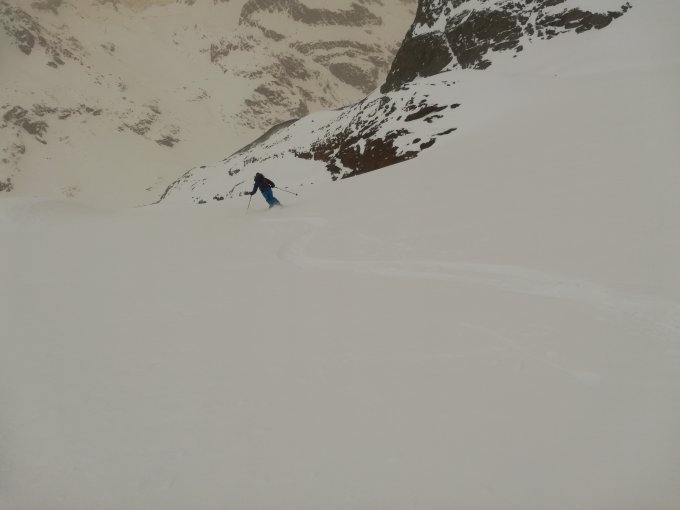 Das Wetter hat viel Arbeit geleistet am Berg. Windverfrachtungen und festgepresste Passagen, Pulver - eher wenig. Rein die Wetterstimmung zum anschauen war schon sehr speziell.