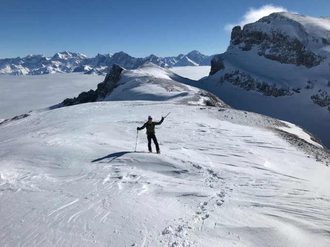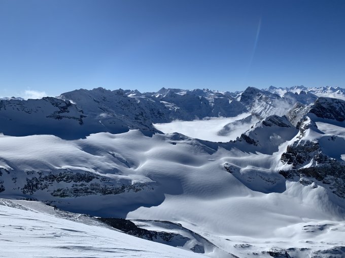 Start 7:15 bei -6.5 °C in St. Jakob. Auf sehr guter Spur (Dank an die Vorspurer vom Freitag für die hervorragende Spuranlage!) bis zur Gitschehörlihütte, ab dort einem Alleingeher folgend auf meist schwach eindrückender Spur. 30 cm Pulverschnee auf fester Unterlage bis gegen 2200m. Zwischen 1300 und 1700 m bewegte man sich in der Nebeldecke, darüber stahlblauer Himmel, schwache Bise. Ab der Steilstufe (lawinentechnische Schlüsselstelle der Tour) unterhalb P2340 dann mit Winddeckel, zwischen P 2428 und P2695 dann oft Hartschneeunterlage. Rotstocksattel z.T. aper gefegt, Skidepot etwa dort, wo die gestrichelte Abfahrtsvariante direkt zur Aufstiegsspur hinab abzweigt. Mit Pickel & Steigeisen zum Gipfel, es ist nicht eisig, der Wanderweg ist gut erkennbar. Pickel ja, Steigeisen sind Geschmacksfrage.