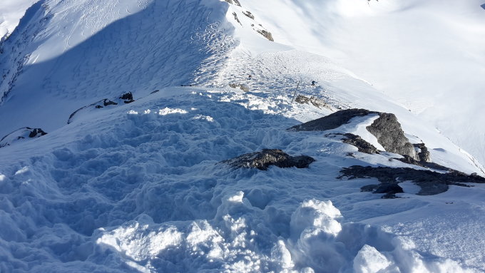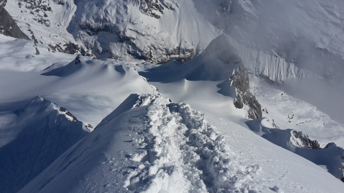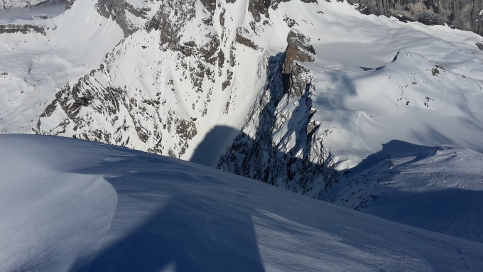 Im Ruchenchälen kalt und windig mit zum Teil starken Böen. Die Neuschneemenge variiertvon 5cm unten , bis 25cm oben. Die Spuren der Vorraussteigenden wurden quasi hinter den Skies wieder dick zugeweht. Somit " durften" heute auch mit einigem Abstand Nachfolgende, wieder neu spuren; nach dem Motto: Streng-strenger-Ruchenchälen! Der Schnee war zudem schlecht gebunden und rutschte unter den Skiern permanent weg. Ab dem Pass ging es dann auf guter und griffiger Spur gen Skidepot. Auch der Wind war nicht mehr so heftig.