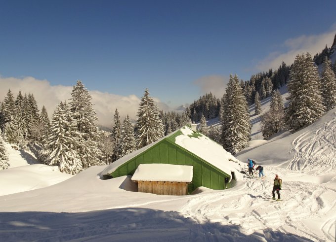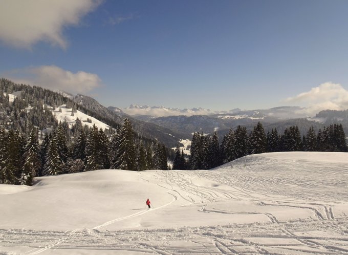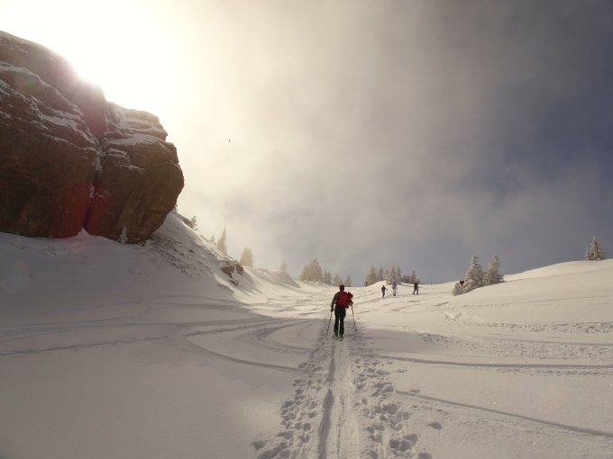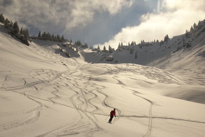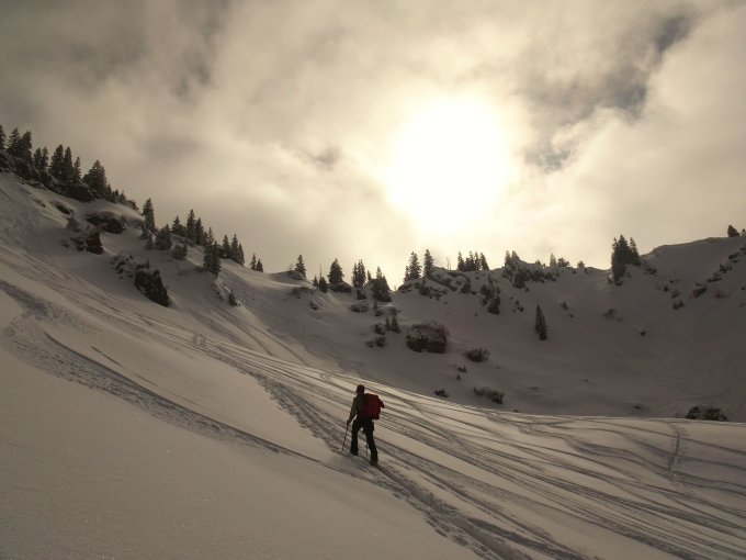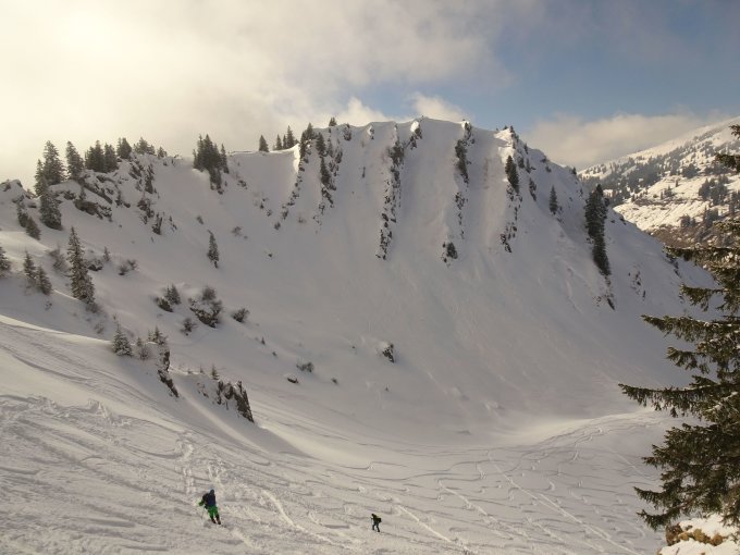 Traumhafter Pulver in den nordexponierten Hängen. Neuschnee ca. 15-20 cm, am besten zu fahren in den flacheren Passagen. Im steileren Gelände kam man teils noch auf den harschigen Untergrund. Nach den zwei Abfahrten zur Siplingeralpe haben wir heute noch eine vom Heidenkopf zur Scheidwangalpe drangehängt. Erstaunlicherweise überall noch rel. wenig verspurt und viel Platz.