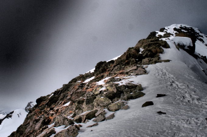 Aufstieg zum Gipfel ab Skidepot durchgehend im Schnee; gute Tritte in griffigem Schnee. Nur wenige Stellen hart, wo dann Steigeisen angenehm sind.