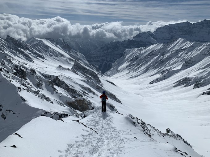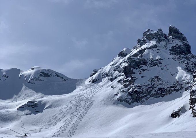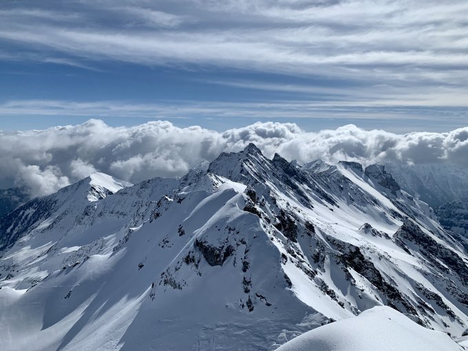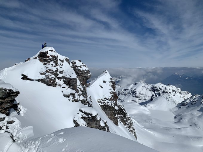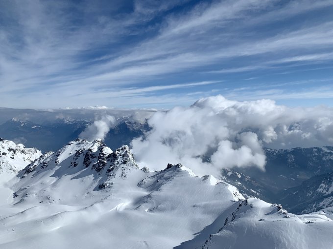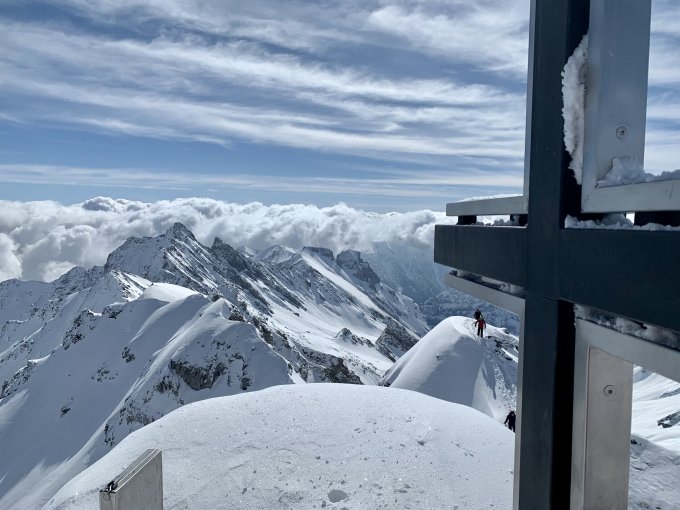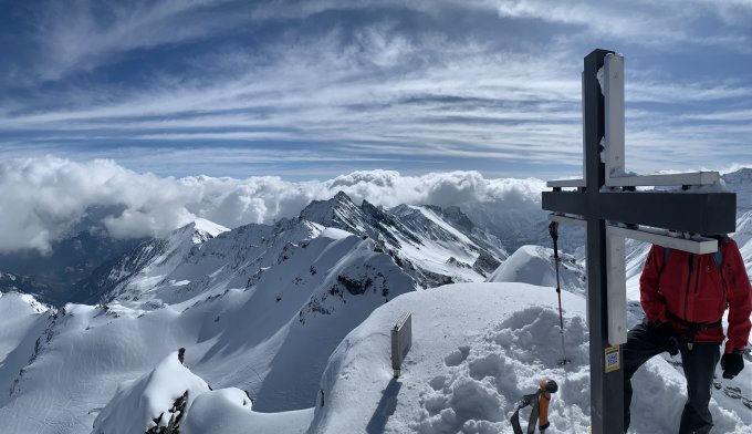 Heute war wirklich alles ausgezeichnet, prächtig wäre auch ein schönes Wort – eine feine Pulver Neuschnee Auflage von unten bis oben, ein großes blaues Loch am Himmel bei sonst recht umwölktem Panorama, angenehme Temperaturen, kaum Wind und der Aufstieg zum Gipfel direkt über die Blöcke - perfekt.