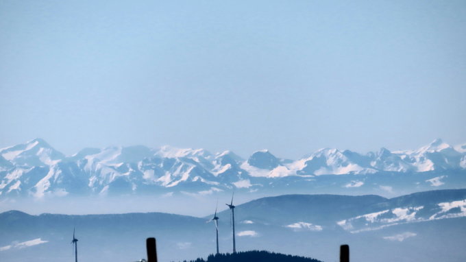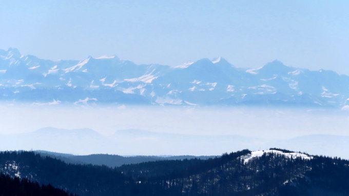 Gute Alpensicht auf die Gipfel zwischen Säntis und den Bergen in der Westschweizer Alpen.