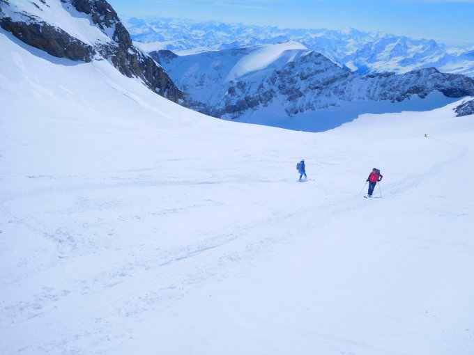 Nach einer sehr kurzen Nacht, Start am 4.45 Uhr bei Tierfehd, die Ski konnten sofort montiert werden, schnelle leicht glasige Spur bis Hintersand, der Aufstieg durch den Wald war etwas mühsam, schon bald wurde es wieder griffiger, der erste Abruch wurde links bei gutem Pulverschnee umgangen, der zweite Abruch