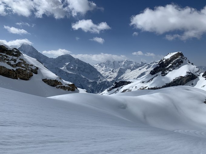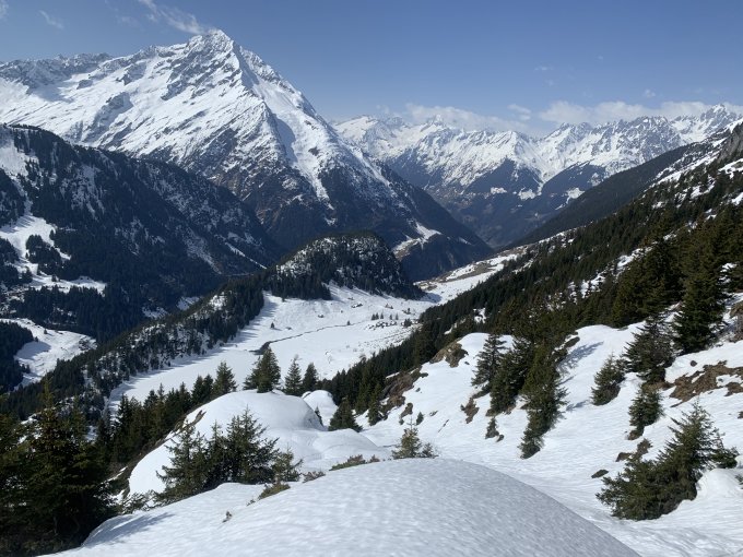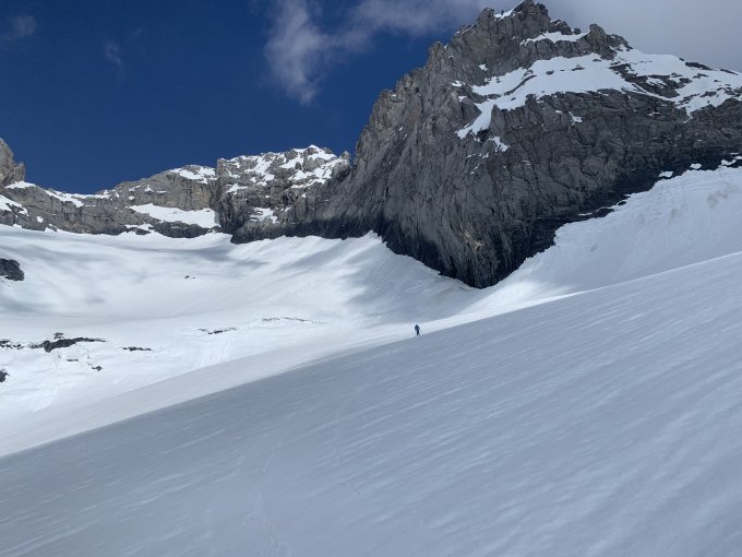 Früher Start an der Bergstation Golzeren um 4:30 Uhr. Bis gegen 1600 m nasser Pflotsch aufgrund deutlicher Plusgrade. Darüber zog es dann etwas an, was Dank vorhandener, älterer Spur über Hüttenboden kein Problem war. Spur bis gegen 1800 m, dann alles unverspurt. Hänge oberhalb 2000 m tragend gefroren. Die gemeldeten „durchziehenden Wolkenfelder“ waren eher eine durchgehende, mittelhohe Wolkendecke mit Basis gegen 3000 m. Unterhalb im Aufstieg kontrastarm, im Couloir/NE-Flanke und am Gipfel dann dicke Wolkensuppe. Dank Bewölkung hatte das Couloir selbst im Abstieg noch gut gefrorenen Trittschnee, auch die herabhängenden Eiszapfen blieben an Ort und Stelle. Heute war dies sicher ein Vorteil, das ost-orientierte Couloir bekommt sehr früh Sonne. Couloir bis Gipfel gespurt, letzter Gipfelbucheintrag vom 4.03.21. Es hat nun eine sehr schöne Spur, z.Zt. wäre das Couli wohl auch fahrbar (bis 50 Grad). Mit Vorsicht zu geniessen ist der Bereich Skidepot - Übergang Couloir resp. NE-Flanke. Skidepot mehr oder weniger auf einer eingeschneiten Randkluft, danach werden mehrere Spalten, zT. geöffnet, mit beherzten Zügen überwunden. Wir hatten Seil & wenig Sicherungsmaterial dabei, setzten es aber nicht ein, da eine vernünftige Sicherung, insbesondere im Abstieg, nicht machbar ist. Abfahrt 11 Uhr ab Skidepot war perfekt, Hänge bis gegen 2000 m waren gut aufgefirnt. Vom Abfahrtsgenuss gut, wenngleich nicht so perfekt wie ich es für diese Expo mit dem vergangenen Wettergeschehen erwartet hätte. Im Wald darunter dann, wie von powderdream09 passend beschrieben, grosser Murks. Man kommt irgendwie durch...