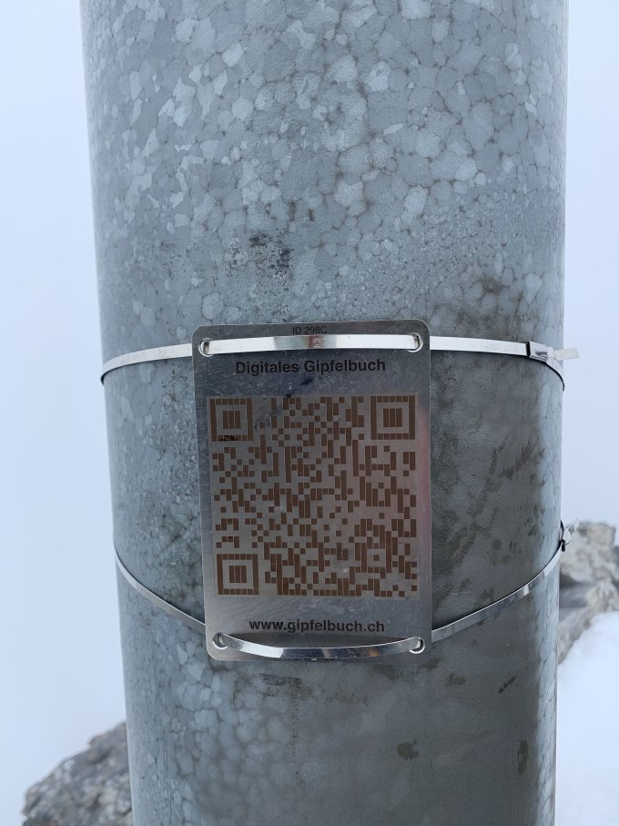 An der Wetterstation auf dem Gipfel noch eine QR Code Plakette für das elektronische Gipfelbuch montiert.