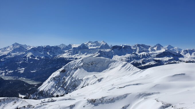 Oben Pulver vom feinsten und das im April am Mändli. Aber er wird schnell schwer! Auf dem Waldsträsschen bis Alp Brosmatt gerade so genug zum Aufsteigen. Beim Abfahren dann schon einige kurze Tragestrecken und Teer-Kontakte :( Aber insgesamt war es noch sehr lohnenswert.