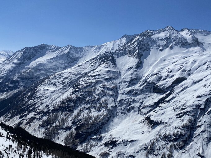 Abfahrt Hütte um 12.30 Uhr war perfekt heute. Sensationelle Bedingungen bis zur Passstrasse. Ab dort auf sehr schmalem Schneestreifen so weit es geht mit den Skis. Wer beim Waldaufstieg parkiert hat, trägt die Skis keine 5min.