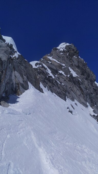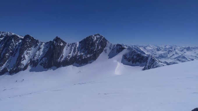 Um 7:00 Uhr in der Medelserhütte gestartet. Ruppige Abfahrt teilweise über Lawinenkegel auf 2350müM. Dann teilweise mit und ohne Harscheisen bis zum Skidepot in meist guter Spur.