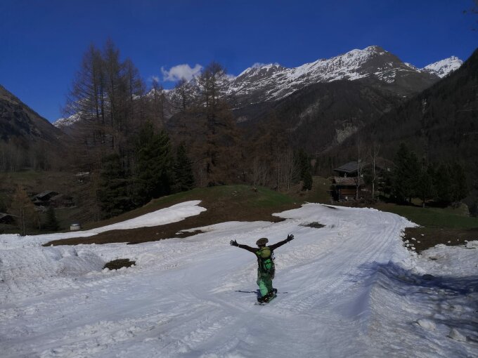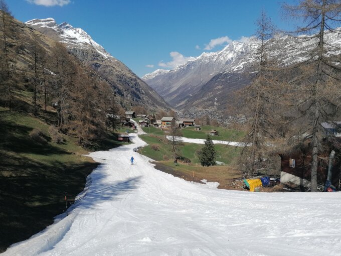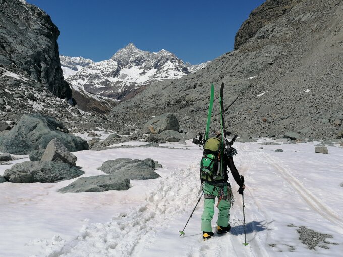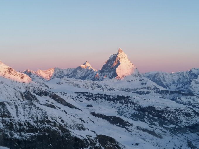 Überwindung Bergschrund am Sattel unproblematisch, allerdings war es bitter kalt (-15°C) und der Grat zum Teil eisig, man muss hier und da Schrauben, und Tritte/ Stufen hat es auch nichts gutes. Wir hatten gehofft das der Neuschnee dden Grat griffig macht, doch es liegen oftmals wenige Zentimeter Schnee auf Blankeis, was dann Abstieg mühselig macht. Wir hatten zwar extra Schrauben und ein Eisgerät dabei, doch bei der kälte haben wir uns ziemlich schnell wie die meisten Seilschaften zum Rückzug entschieden. Abfahrt bis 3800m Traumhaft, das wussten auch die Heliskier. wir sind raus Richtung Gronerschlucht. Man kann bis 500m vor die Schlucht fahren, dann muss man zu Fuss weiter und diese mit 100hm Wanderung umgehen, danach nochmal ca. 45 min. Wandern bis zur Skipiste über Furi. Skipiste ist noch Fahrbar bis Zermatt, bei Furi gibt es bald wenige Laufmeter bei der Bahnstation. Um 15:30 wieder in Zermatt