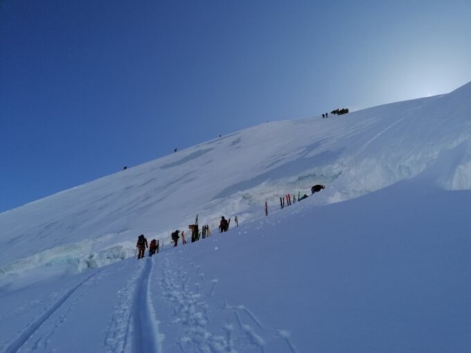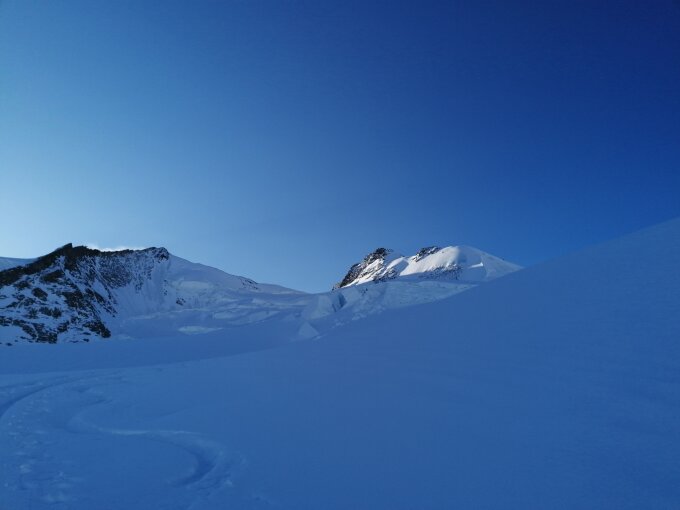Start um 04:30 von der Monterosahütte, Zustieg am Vortag über Schwarztor gut, unteren 150hm haben dünne Schneeauflage, Feindkontakt möglich. Essen Bewartung auf der Hütte wie immer top, da stimmt auch der Nachschlag. Es liegt eine super Spur bis zum Sattel vom Westgrat. Das heisst, von der Hütte weg bis zum Sattel ohne Harscheisen und das mit Board. Bis 3800m Schnee mit Harschdeckel, danach Pulver, ca. 20-30cm, am Sattel ungefähr um 8:30. Bis jemand eine Spur gezogen hatte und mit Stau, war es dann bald 10:00, Ca. 10 Seilschaften waren unterwegs.
