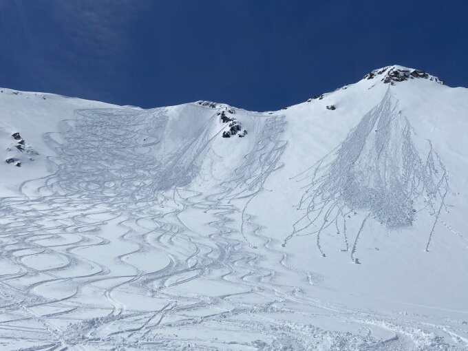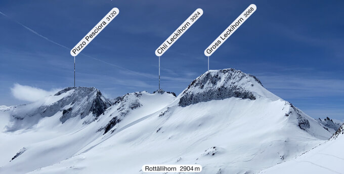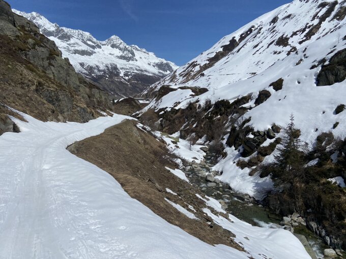 mehrheitlich blauer Himmel, einige Wolken. Temperatur am Tourenstart leicht unter null Grad. Realp bis Höhenbiel starker Wind von Süd bis West. Stelliboden bis Gipfel T-Shirt Wetter. Auf dem Gipfel eine leichte Brise. Markante Erwärmung im Tagesverlauf. Es hat ca. 20 cm Triebschnee in die Nordhänge der Route verfrachtet, der im Tagesverlauf insbesondere unterhalb Stelliboden sehr schwer wurde. Trotz Triebschnee keine Lawinenanzeichen auf der Route. Im felsdurchsetzten Gelände oberhalb recht zahlreiche Lockerschneelawinen. Am Gross-Läckihorn ist eine grössere Lawine abgegangen. Abfahrt Nordost-Couloir (ca. 45°) trotz Trieb- und Neuschnee stabil. Skier müssen ab Parkplatz Realp bis zur blauen Brücke über die Furka-Reuss getragen werden. Unterwegs im Aufstieg zum Schluecht eine kurze Tragepassage auf der Bergstrasse.