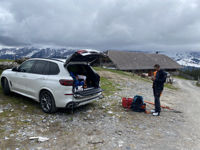Immer noch überraschend gute Verhältnisse. Ski kann man ca. 15 min nach Alp Schlund anziehen und losfellen.