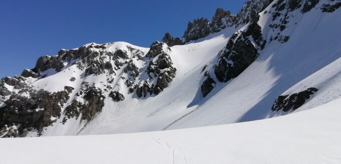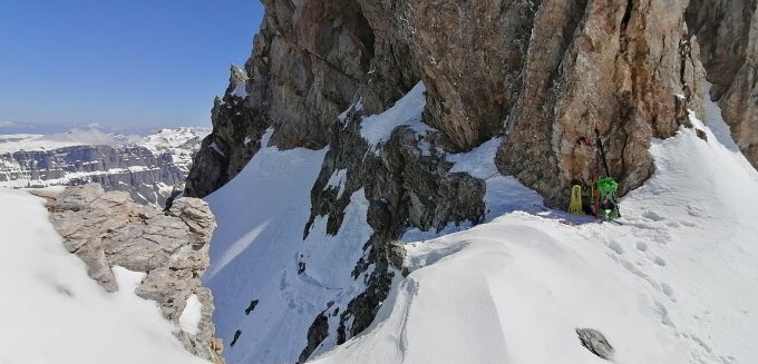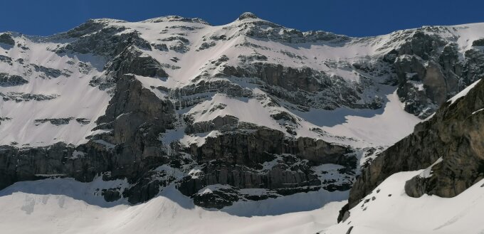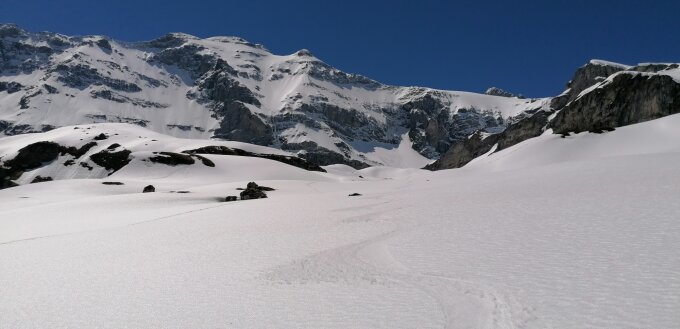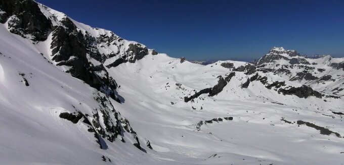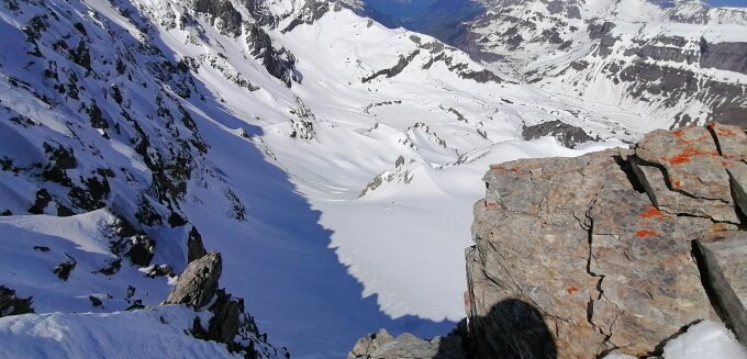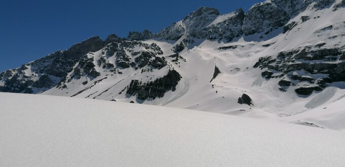 Traumtag mit sehr guten Verhältnissen auf der ganzen Tour. Am Morgen hart und griffig mit sehr wenig Neuschnee von Gestern ab ca. 2200 müM. Am Schärhorn ab 3000 müM mit Harsteisen zum Skidepot und mit Steigeisen zum Gipfel. Beim Abstieg vom Tüfelsjoch mit Steigeisen und Pickel ( die Ketten sind zum grössten Teil unter dem Schnee)
