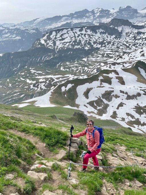 Der Weg führt im Halbkreis rund um den Wasserberg. Sehr steil, aber gut ausgebaut und markiert. In den Mulden liegt noch Schnee, der aber gut umgangen werden kann. Kurz vor dem Gipfel hat es Ketten, für den Fall, dass die Steine nass sind.