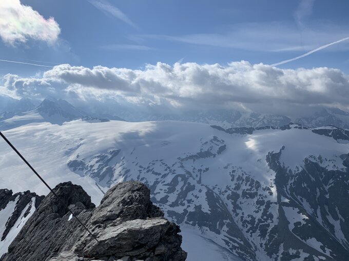 Am Vorabend noch ein kräftiger Regenschauer, Aufklaren erst in der zweiten Nachthälfte. Entsprechend warm und nicht durchgefroren. Fründengletscher ohne Steigeisen begehbar, kein Einsinken. Felsteil Fründenhorn oft nass, dank Wärme kein Wassereis. Gipfelflanke Griessschnee mit Deckel, gutes Vorankommen auf Lawinenbahn bis zum Ansatz des Felsriegel. Felsriegel im Aufstieg ganz links aussen überwunden, zwei Sicherungspunkte und Seil sind frei. Im Abstieg über Schneeband Mitte des Riegels durch. Oberster Gipfelhang mühsam, z.T. knietief eingebrochen.