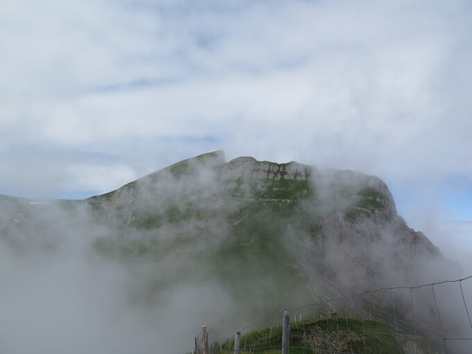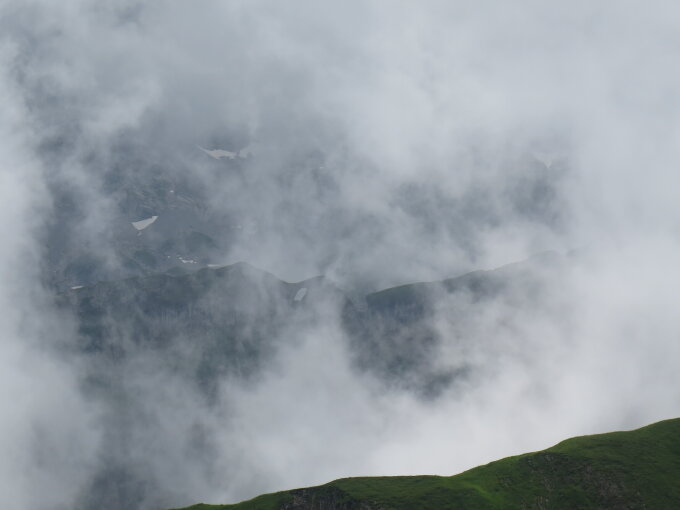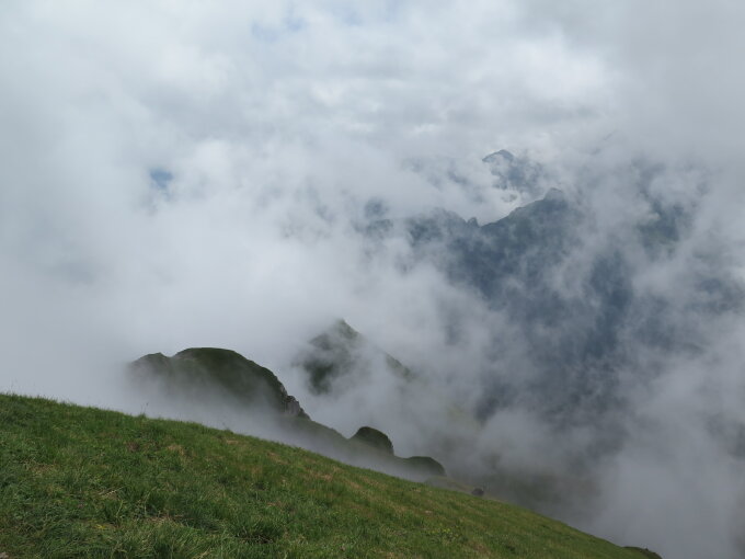 Eigentlich wollte ich die Schwalmis via den Schwalmisbänder und den Arengrat runter machen. Da der vordere teil schon oft schmirig war, folgte ich dem Wanderweg auf den Gipfel. Und bin via Hinterjochli und Brisenhaus zur Bärenfallen und zur Musenalp. Dort gibt es feinen Lebkuchen. 1fache Fahrt 8.-mit der Bahn. Für gut war es zu schmierig.