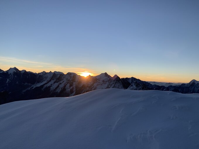 Start um 5 Uhr bei sternklarem Himmel und leichten Minusgraden. Blümlisalpgletscher ab Einstieg mit Pulverschneeauflage, verbreitet Schmelzharschdeckel. Bis 3100 m auf Spur Richtung Rothornsattel, dann selbst gespurt. Flanke Morgenhorn letzte 100 Hm Schneekruste auf Eis. Mit je einem zusätzlichen Eisgerät und Vertrauen in die Frontzacken ging es ohne Schrauben. Grat komplett gespurt, 10-20cm Pulverschnee z.T. mit Deckel. Abstieg Blümlisalphorn zur Hälfte im Trittschnee sehr angenehm, Rest dann eher heikel auf dem abwärts geschichteten, splittrigen Kalk mit Schneeauflage. Mit 40 m Seil an den Eisenstangen aber vernünftig absicherbar. Um 12 Uhr zurück auf der Hütte.