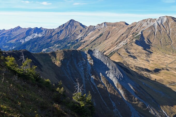Perfekte Herbstverhältnisse am Berg. Alles trocken und deshalb problemlos begehbar. Nur der starken Föhnsturm machte es zu einem etwas garstigen Unternehmen. Nicht kalt aber auf der Dauer wünscht man sich mal etwas Windschatten...