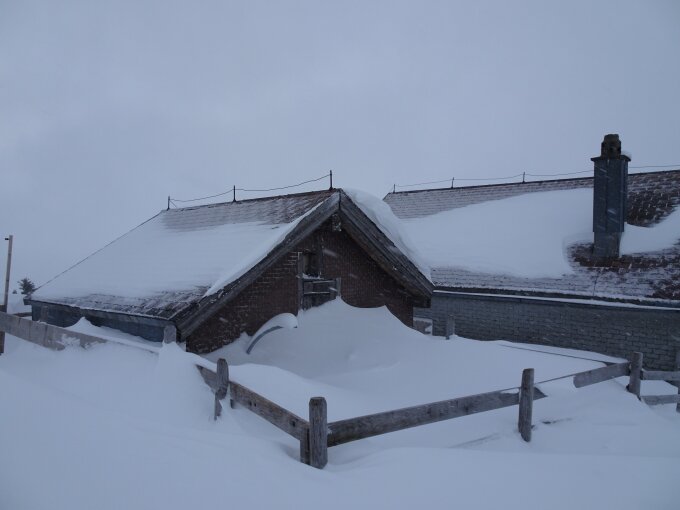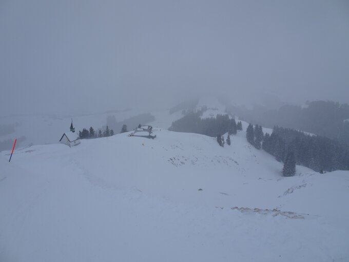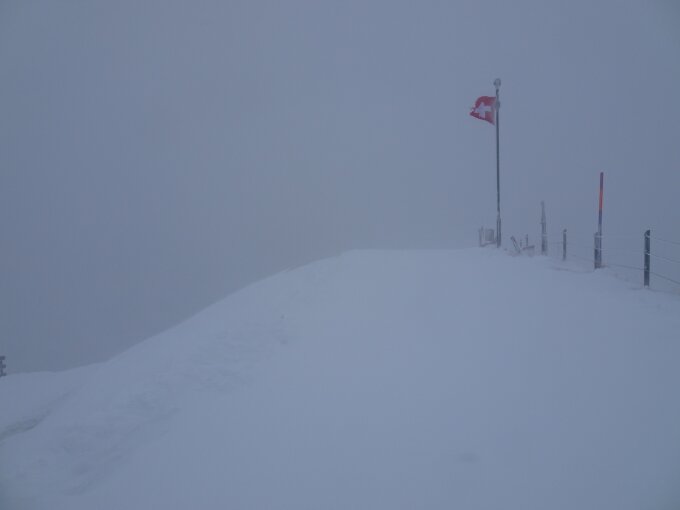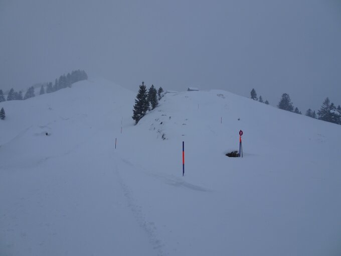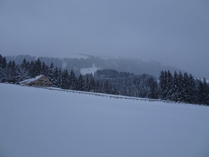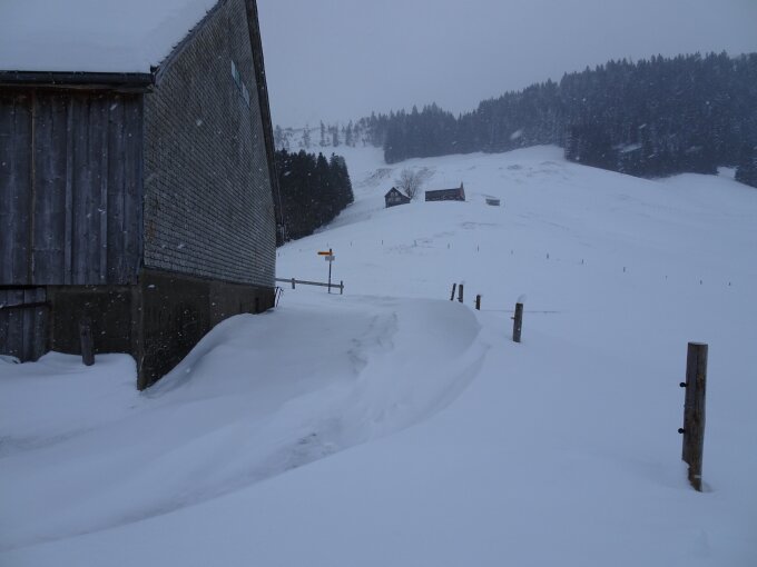 Bis zur Alp Löchli meist um die 20cm, oder mehr, Einsinktiefe. Nach der Alp oft knietief eingesunken, aber auch wieder abgeblasene Grasbüschel vorgefunden. Nach P.1280 bei der Querung Richtung Scheidegg auf kurzem Abschnitt etwa 80cm tief durch den eingeblasenen Schnee gewühlt, dann oft knietief bis zur „rettenden“ präparierten Piste; die aber vom Wind auch viele eingeblasene Passagen hatte.
