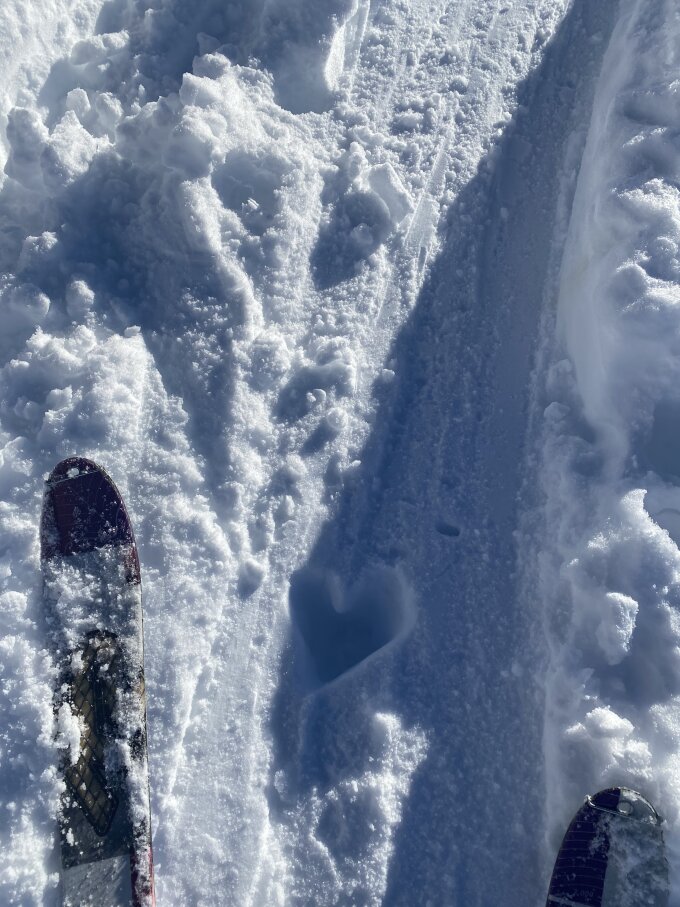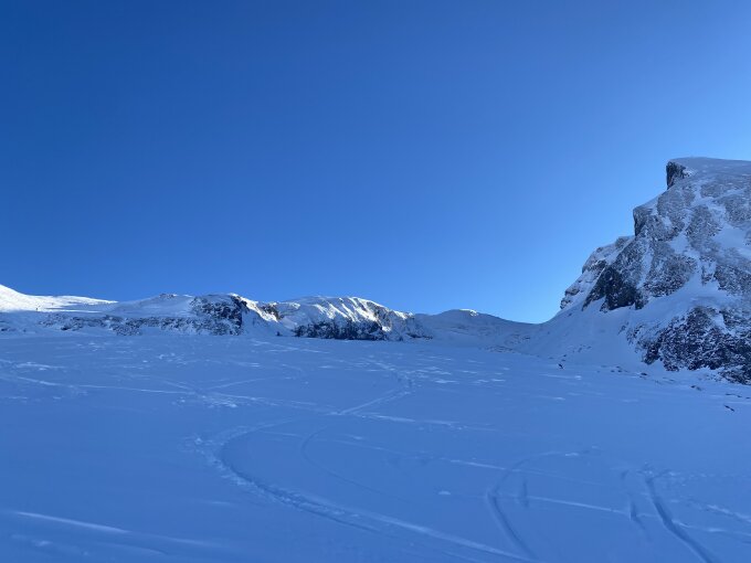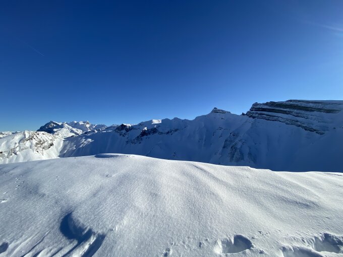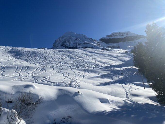 Gute Aufstiegsspur bis zum Gipfel. Viel Schnee im Gebiet, in den Schattenhängen toller Pulver ansonsten schwerer Pulverschnee.